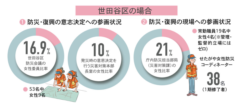 2024年元旦に発生した能登半島地震では、避難所運営をはじめ、依然として災害時対応に女性たちのニーズやジェンダーの視点が十分に反映されていない実態が浮き彫りになりました。原因として、防災・災害対策の現場・意思決定の場ともに、女性や多様な人の参画が進んでいない現実があります。これは世田谷区も全く他人事ではありません。